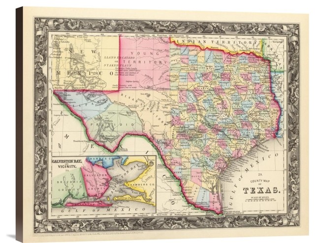 "County Map Of Texas, 1860" Canvas Giclee by Samuel Augustus Mitchell, 16"x13" - Contemporary